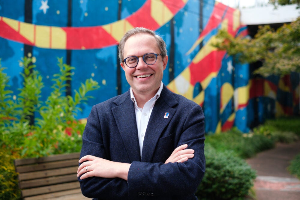 Man in a blue blazer standing in front of a blue, red, and yellow mural